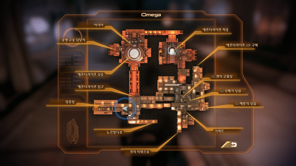 함선내의 맵에서 오메가를 선택해서 오메가로 향합니다. 오메가에 도착하여, 아리아 틸로트 를 만나러 가야 합니다. M 을 눌러 아래 사진처럼 지도를 열고 애프터라이프 하층 으로 갑니다. 애프터라이프 VIP 구역은 지금가도 들어갈 수 없습니다.