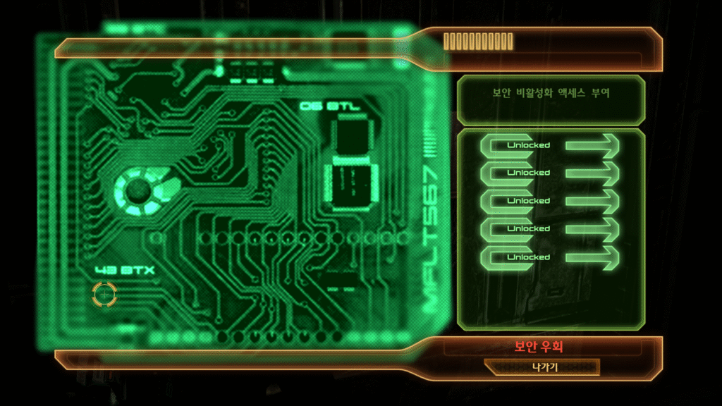 Shift 를 눌러 진행방향 데로 진행하다 보면 잠긴문 하나가 나오게 되는데, 회로퍼즐을 풀어 문을 열어 줍니다.