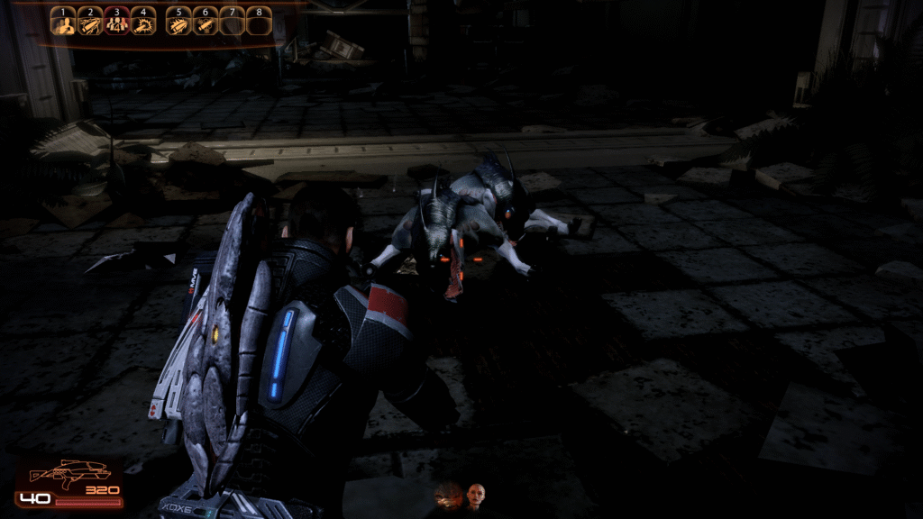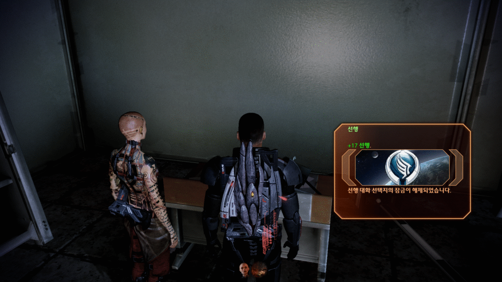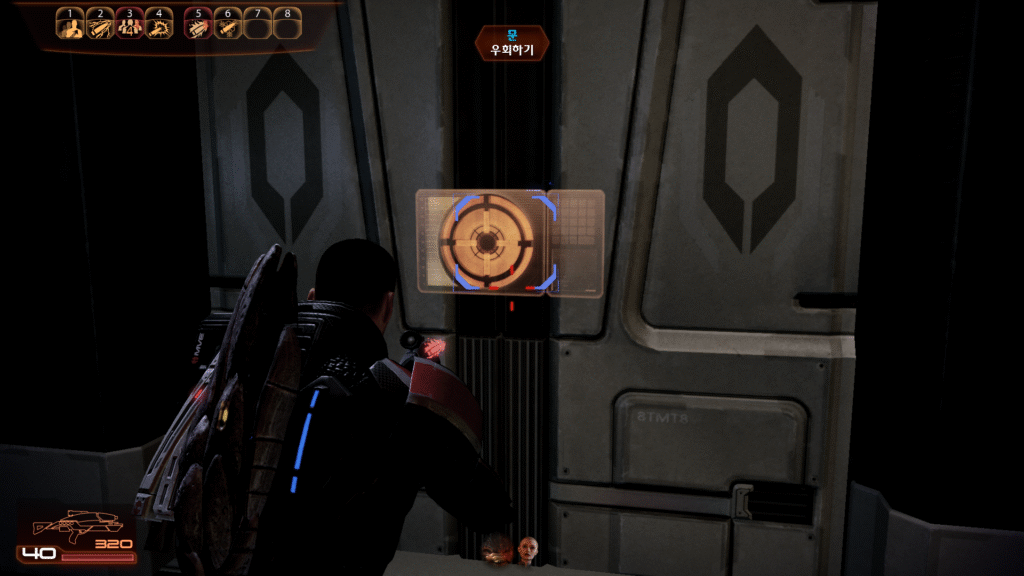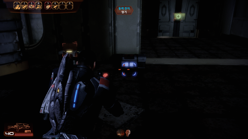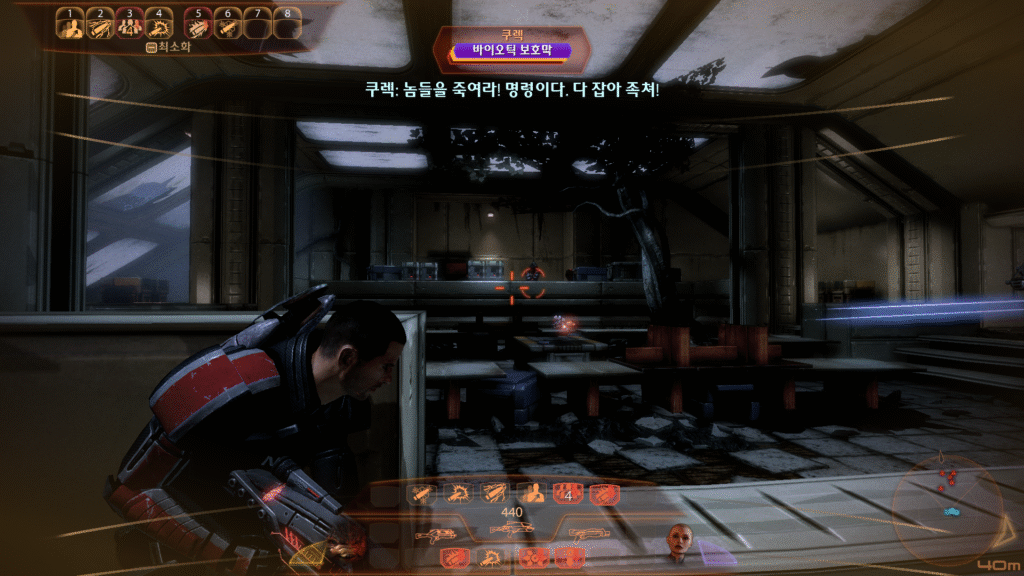 이곳에서 문을 열면 본격적인 전투가 시작되니, 준비를 하고 문을 열면 쿠렉이라는 중간보스가 나오고 전투가 시작됩니다. 원거리에 위치하고 있으므로 스나이퍼등을 이용해 처리합니다. 쿠렉은 바이오틱 보호막을 가지고 있으므로 교란탄을 이용해 바이오틱 보호막을 제거후, 일반 장갑이 나오면 화염탄으로 처리합니다.