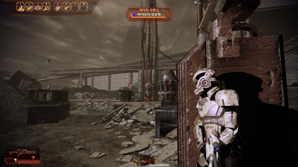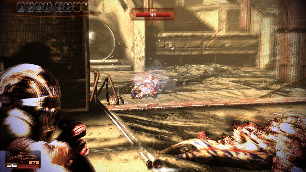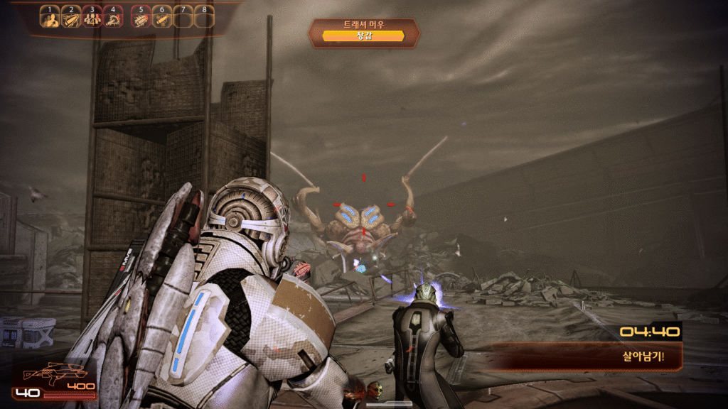 이제 다시한번 버튼을 누르면 트레셔 머우 라는 왕지네와 싸워야 하는데, 중화기를 입에 집중적으로 쏴 체력을 깍아 놓습니다. 최종 보스 답게 체력이 상당히 많고, 멀리서 침을 뱉어 대는데, 2방정도 맞으면 사망할 수 있으니, 엄폐를 하며, 이리저리 피해가며 싸워야 합니다.