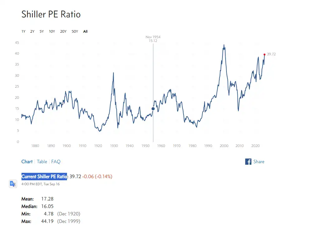 고금리 4%대 환경임에도 불구하고, 높은 Shiller PE ratio 는 시장이 AI 및 테크주에 성장을 지나치게 강하게 선반영하고 있다는 점을 의미합니다. 만약 AI 나 테크주가 기대한 만큼 실적(이익) 이 따라오지 못하다면 주가하락의 위험이 커질 수 있습니다.