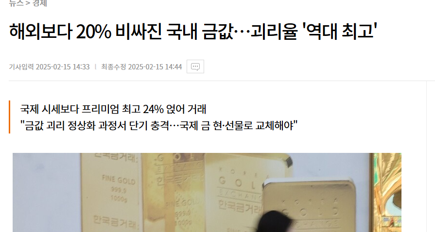 이런 상황속에서 실제로 올 25년 2월에는 아래 사진처럼 20%가 넘는 괴리율 역대 최고를 찍기도 했습니다. 이는 실제 금의 국제시세보다 괴리율 만큼 비싸게 금을 국내에서 산다는 의미로 금 투자에 있어서는 현재 괴리율이 큰지를 반드시 확인해야 합니다.