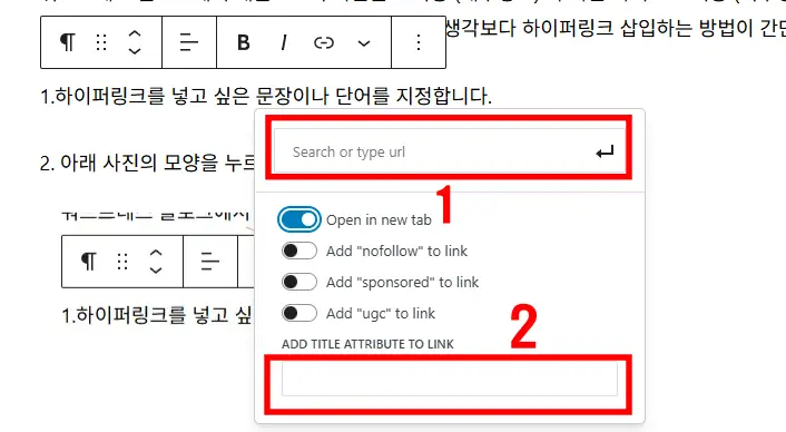 워드프레스 블로그 글작성 시 내 블로그 내의 다른글로 이동해서, 내 블로그 내의 체류시간을 높이거나, 혹은 다른 외부사이트로 이동하는 하이퍼링크를 사용해야 하는 경우가 많은데요.
